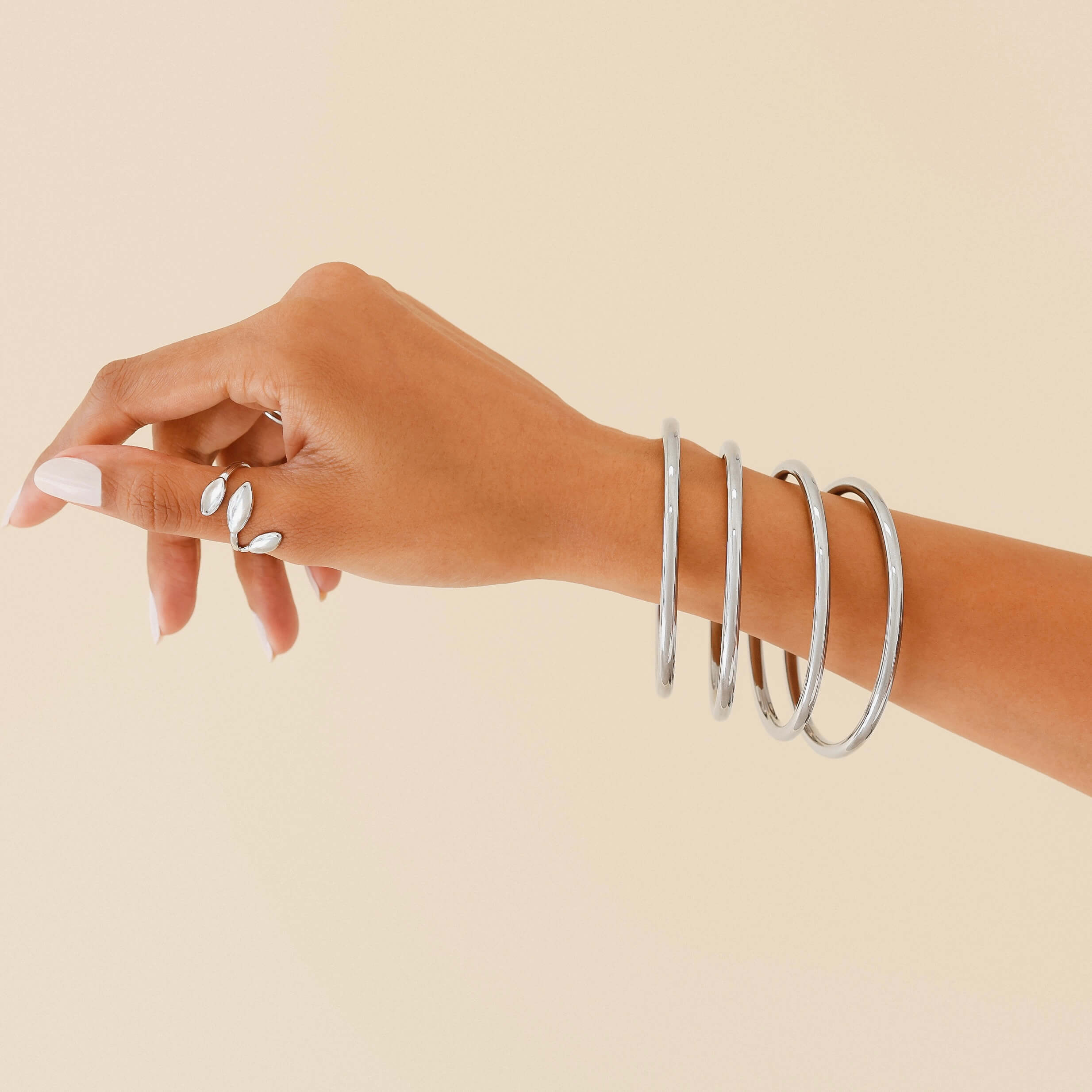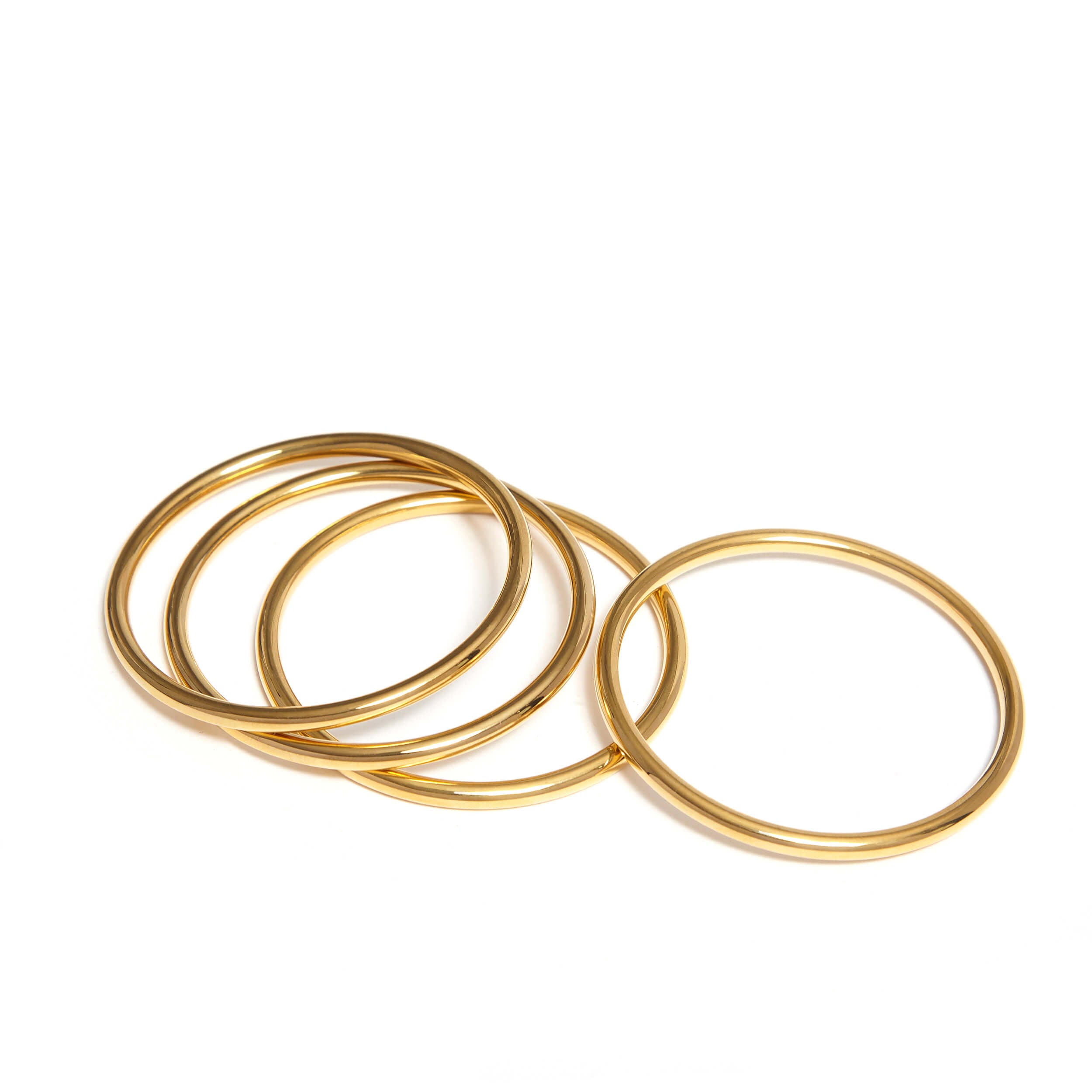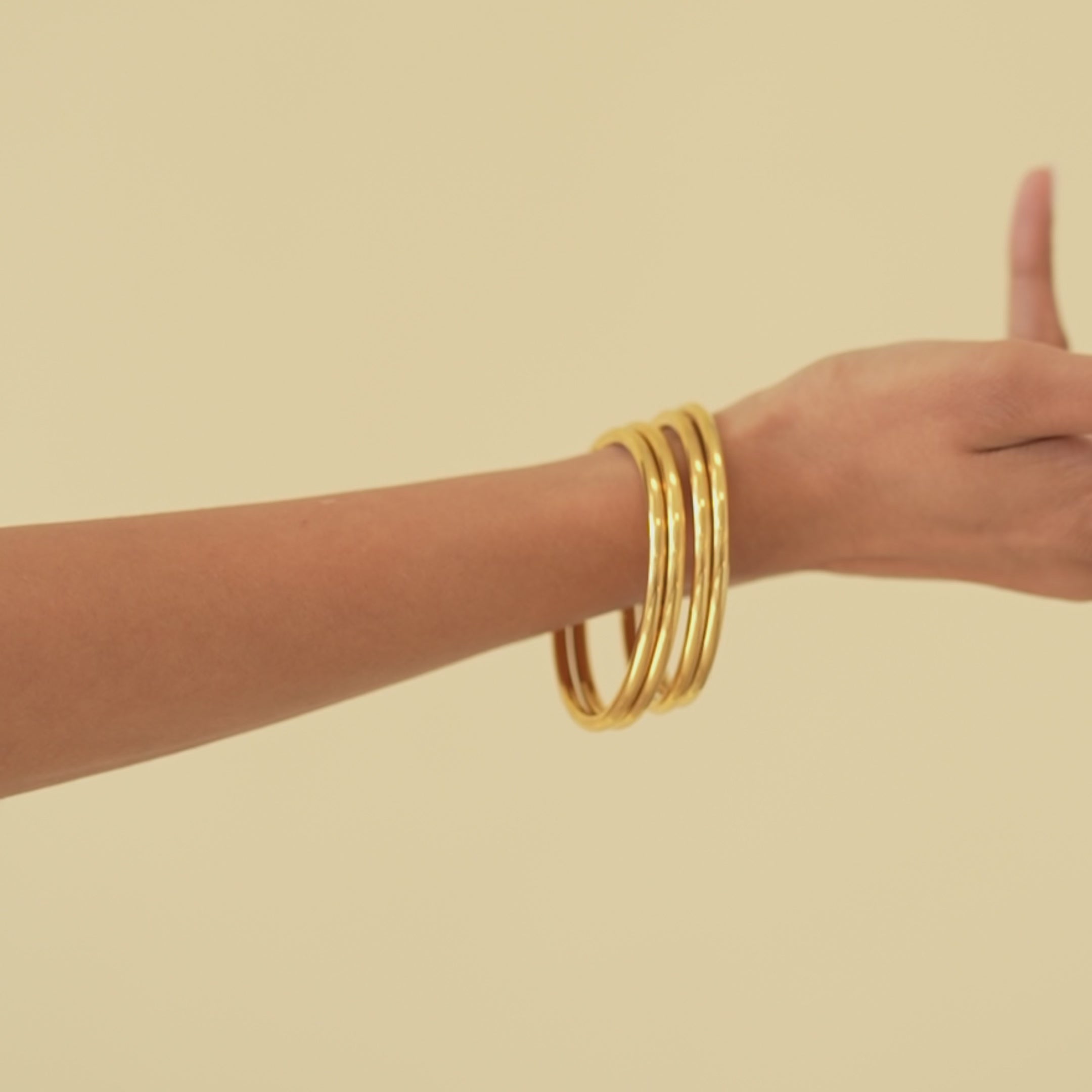 These stunning, minimalist bangles are elegant. & timeless. South Asian women have always worn multiple bangles instead of singles, and this 4-pack is perfect for that layered, classic look. This 4-pack adds versatility—stack them all on one hand for a more bold look, or split them between both hands for subtle elegance & jingle of classic bangles. 100% waterproof & hypoallergenic - wear them all day everyday without any hesitation.