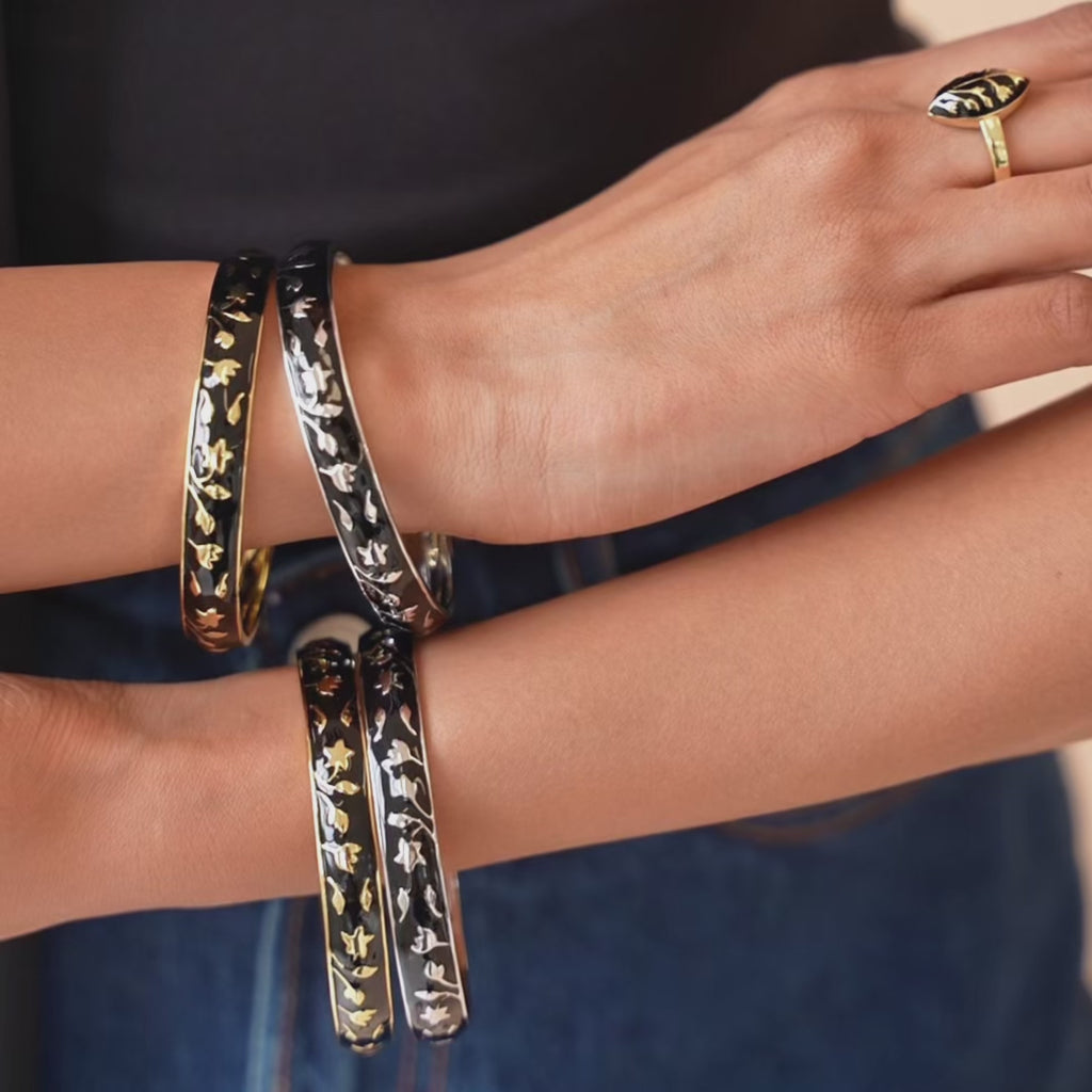 Inspired by traditional Meenakari craftsmanship, these hand-painted enamel bangles are delicately handcrafted with detailed florals and vines. Each set includes two bangles designed to stack effortlessly or shine on their own. A modern nod to heritage, made for everyday wear.