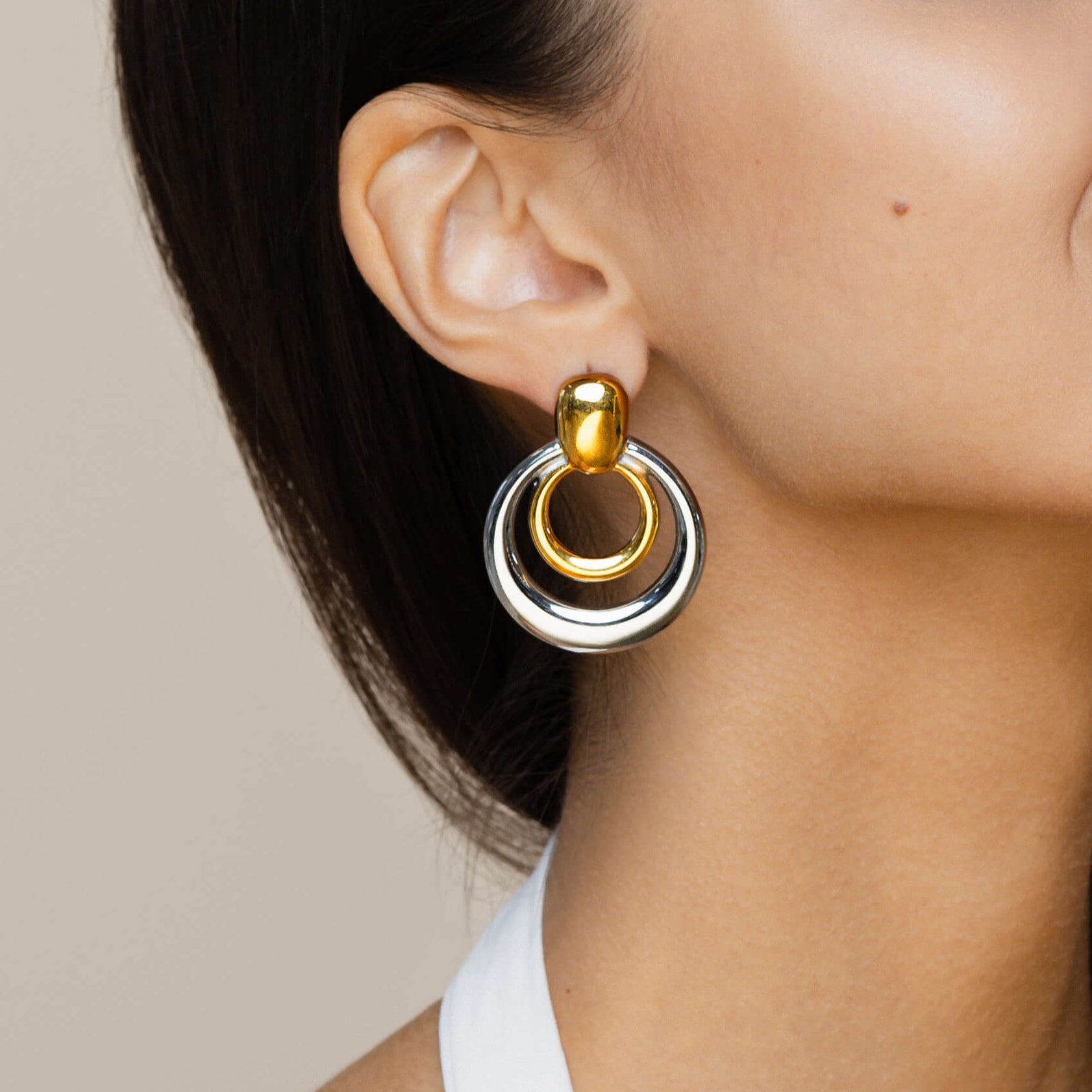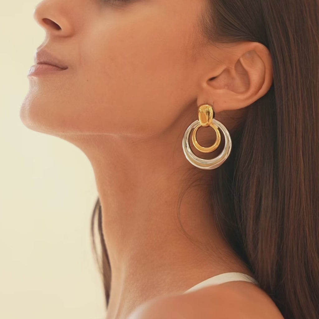 The Saira Earrings are a nod to the nath—circular, simple, and bold. With a double-loop design and sculptural feel, they bring a fresh take on tradition. Available in both two-tone and gold finishes, they’re lightweight, easy to wear, and made to match with everything, from your sari to your little black dress!
