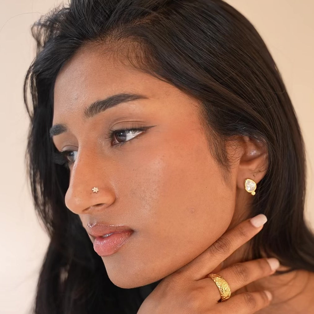 The Fleur Nose Ring features marquise-cut stones arranged into a delicate six-petal flower, finished in 18k gold. Inspired by traditional South Asian florals, it’s designed to be lightweight, chic and perfect for everyday wear