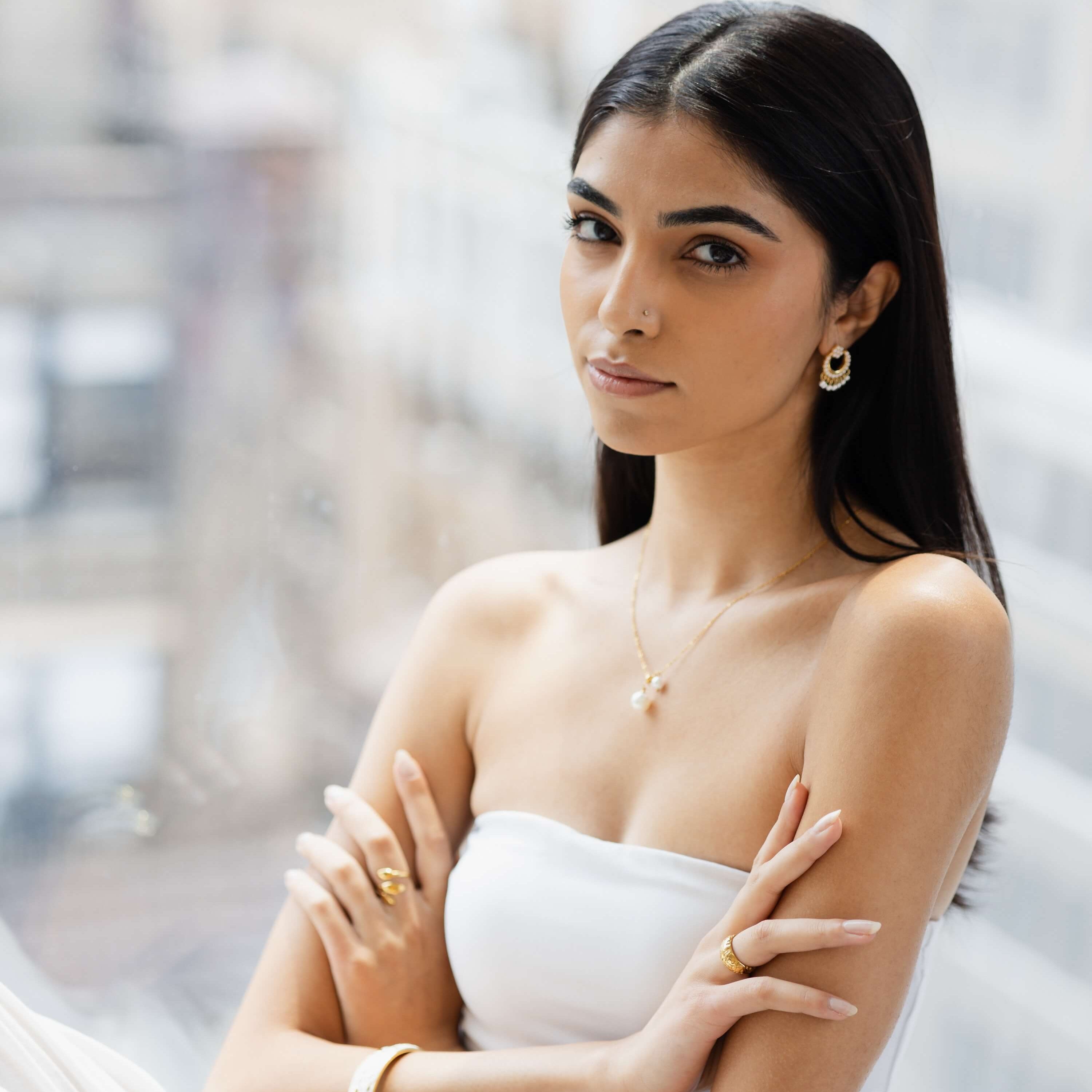 A modern ode to South Asian elegance. Our Twin Pearl Necklace features two luminous pearl drops framed in 18k gold plating, a nod to the layered jewelry styles worn by Desi women for generations. Chic enough for everyday wear yet elevated for weddings and festive looks, this pearl drop necklace is waterproof, hypoallergenic, and designed to layer effortlessly with your favorite BySimran pieces.