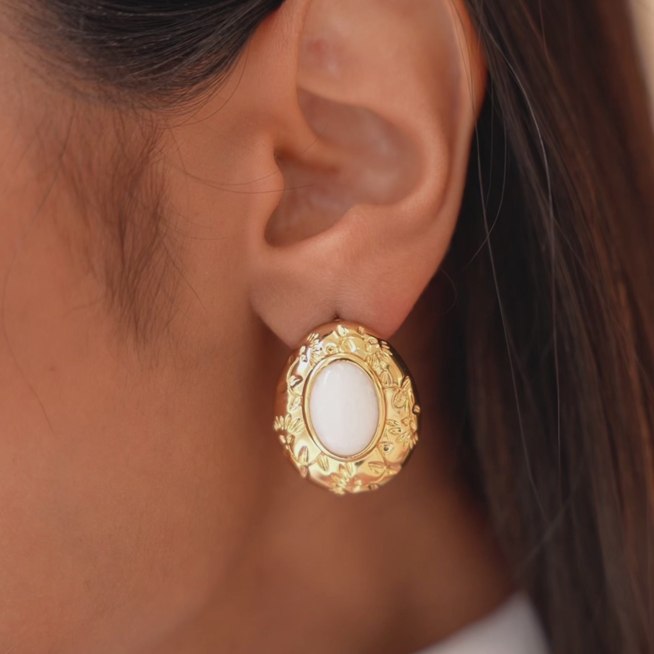 Your Everyday Heirloom ✨ The Rani Gem Earrings bring a timeless South Asian motif into a modern silhouette. Crafted with our iconic 'Rani' floral engraving & finished with a hand-set white jade stone, they’re a versatile piece that feels both rooted in heritage and effortless for everyday wear.