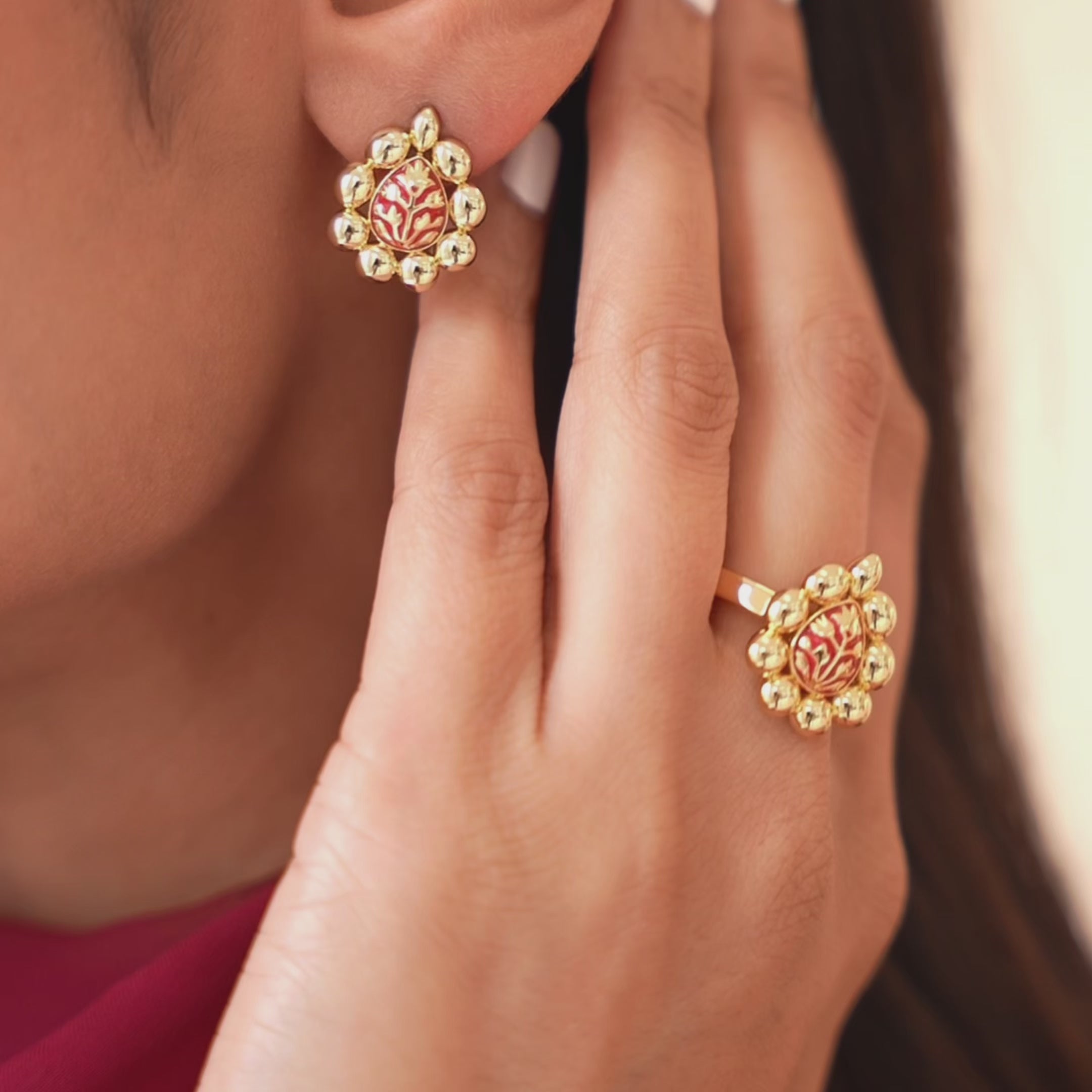 A nod to traditional Meenakari work, the Meena Bloom Ring features delicate, hand-painted enamel petals crafted with care. Its lightweight design makes it perfect for stacking or wearing solo. Add a soft touch of desi chic to your everyday style. Pair with the Meena Bloom Earrings for a complete set.