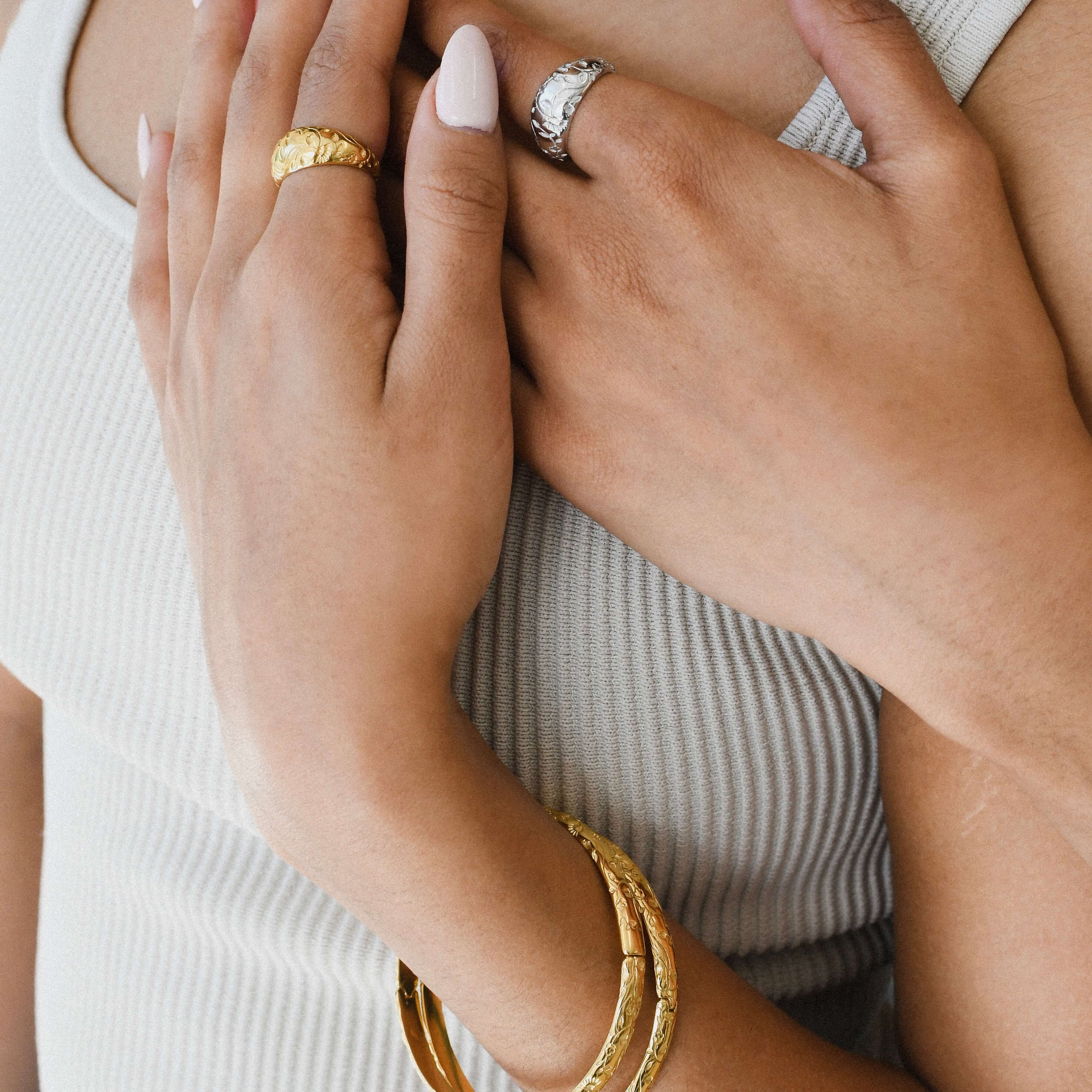 Your favorite chunky gold ring - but make it desi. Our Rani Dome Ring features our iconic engraved rani floral & vine pattern to add the perfect desi touch to elevate your look.