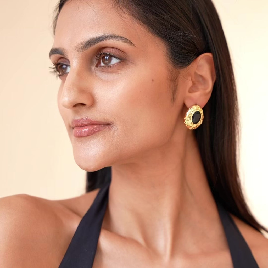 The Rani Gem Earrings are our modern take on a traditional South Asian motif. Each pair features our iconic 'Rani' floral engraving with a hand-set black onyx stone at the center. Minimal but rooted in heritage, they’re designed to be styled again and again - like an heirloom.